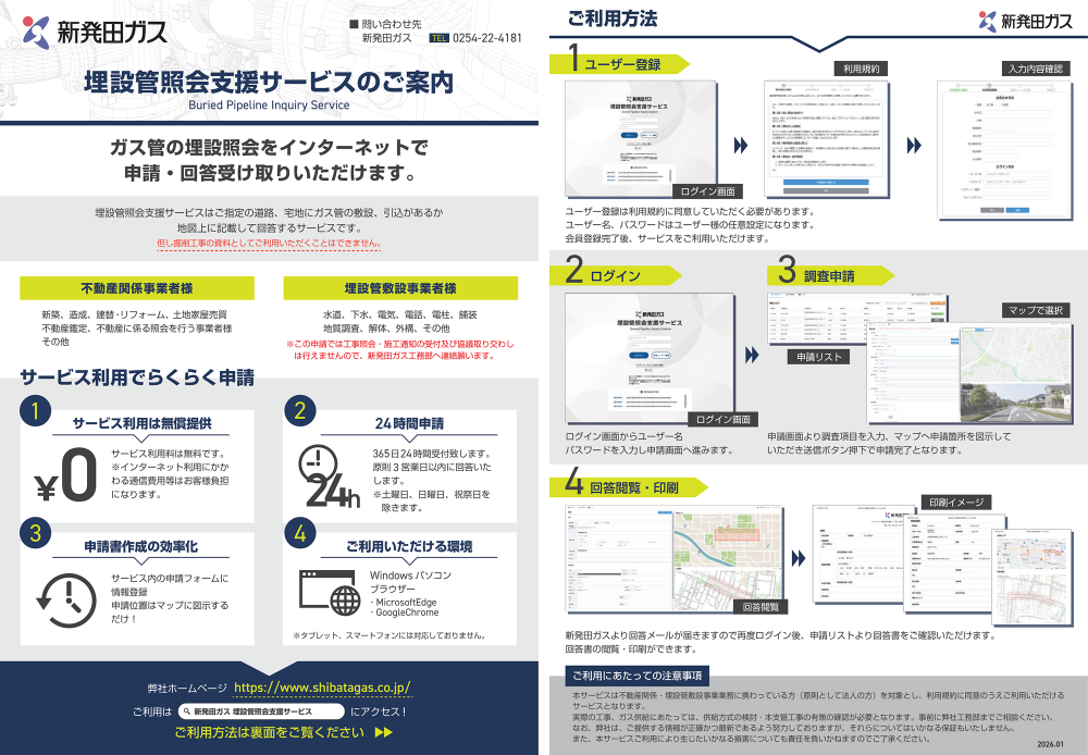 埋設管照会支援サービスは、新発田ガス株式会社の都市ガス供給区域内において、ご指定の道路や宅地にガス管が敷設されているかなどの情報をインターネットのマップ上に記載し、ご回答させていただくサービスです。サービスご利用の対象は、不動産関係、埋設管敷設事業に携わっている方(原則として法人の方)を対象とし、サービス利用料は無料、24時間、365日、ご都合の良いタイミングで埋設照会をご申請いただけます。